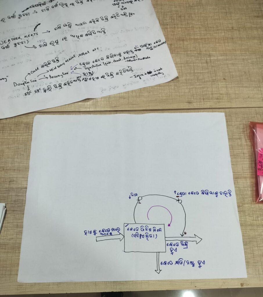 As introduced here, we are conducting a series of SGMB sessions to understand the perceived climate resilience of rural fruit and vegetable supply chains in the Keonjhar district of Odisha. Working with local producers, wholesalers, retailers and consumers, we aim to co-produce a causal-loop diagram describing the ways in which different stakeholders prepare, adapt and recover from extreme climatic